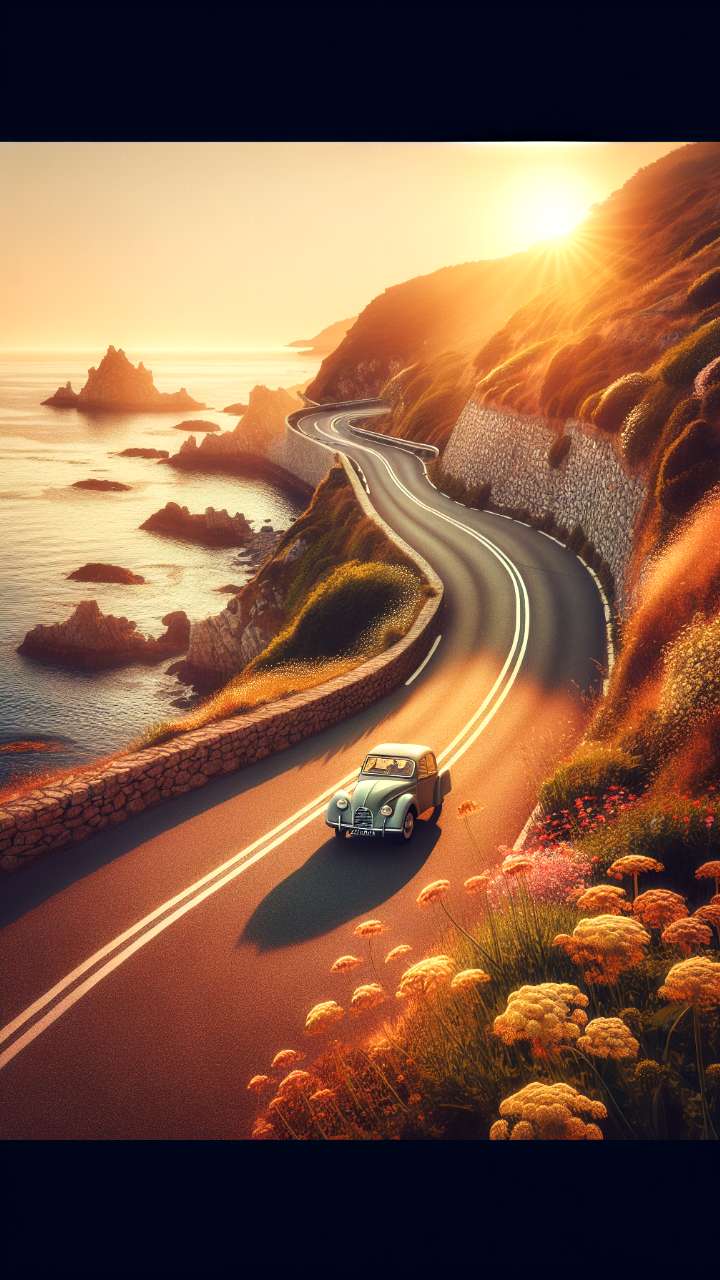 Embark on a serene journey along the whimsical shores in your vintage cabriolet.